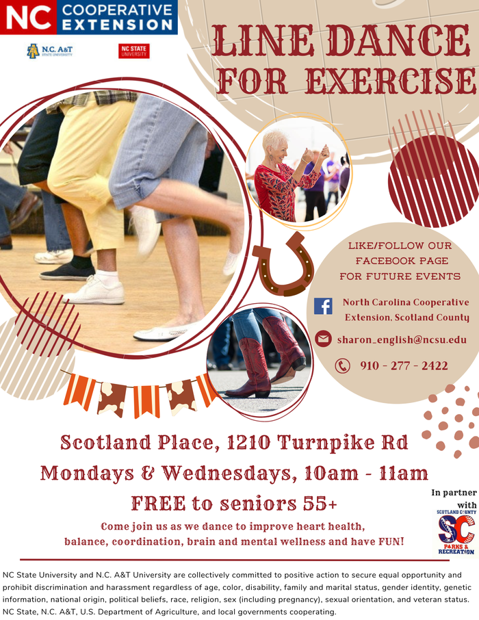 Line Dance for Exercise classes are offered twice a week for adults 55+ through a partnership with Scotland County Parks and Recreation.